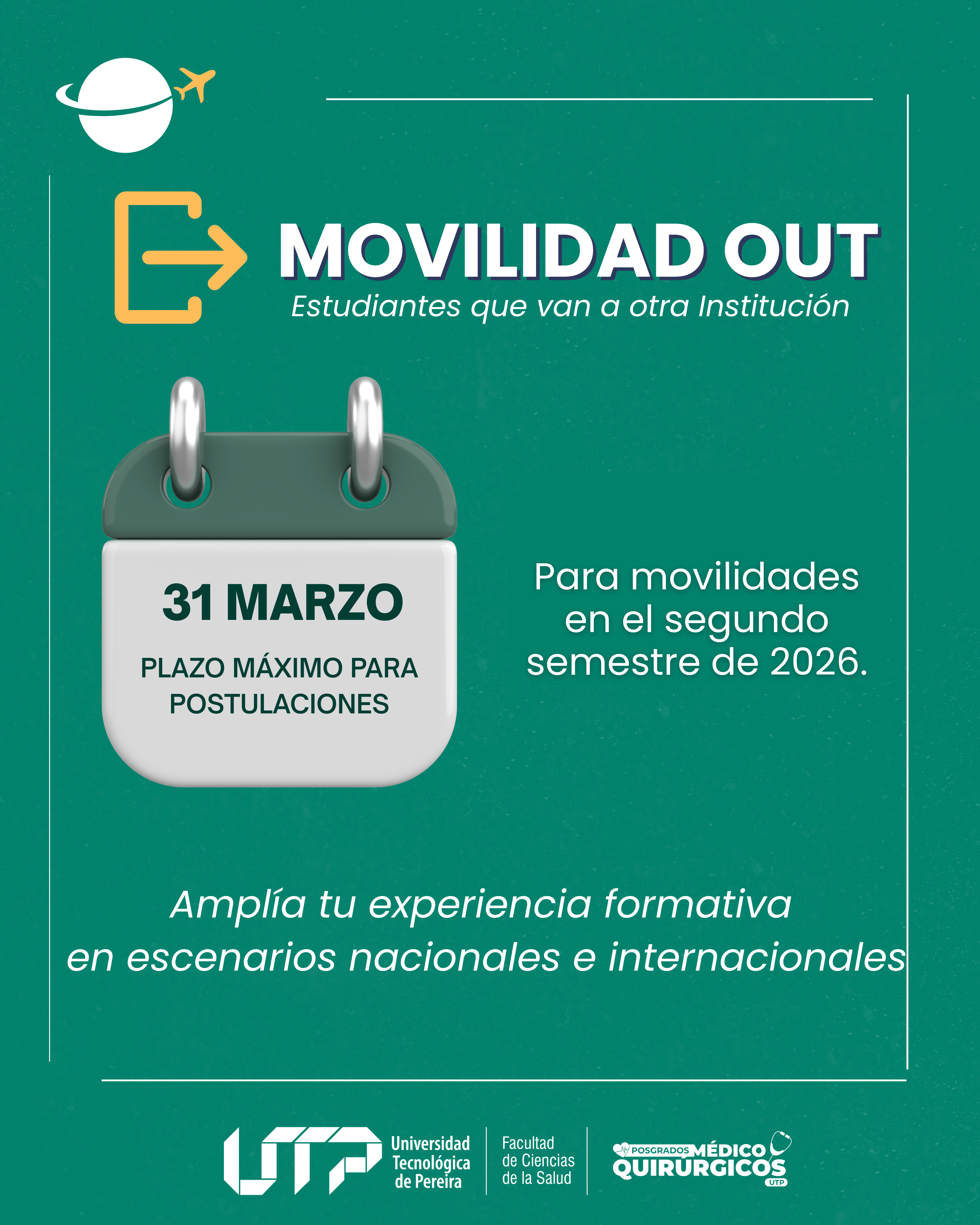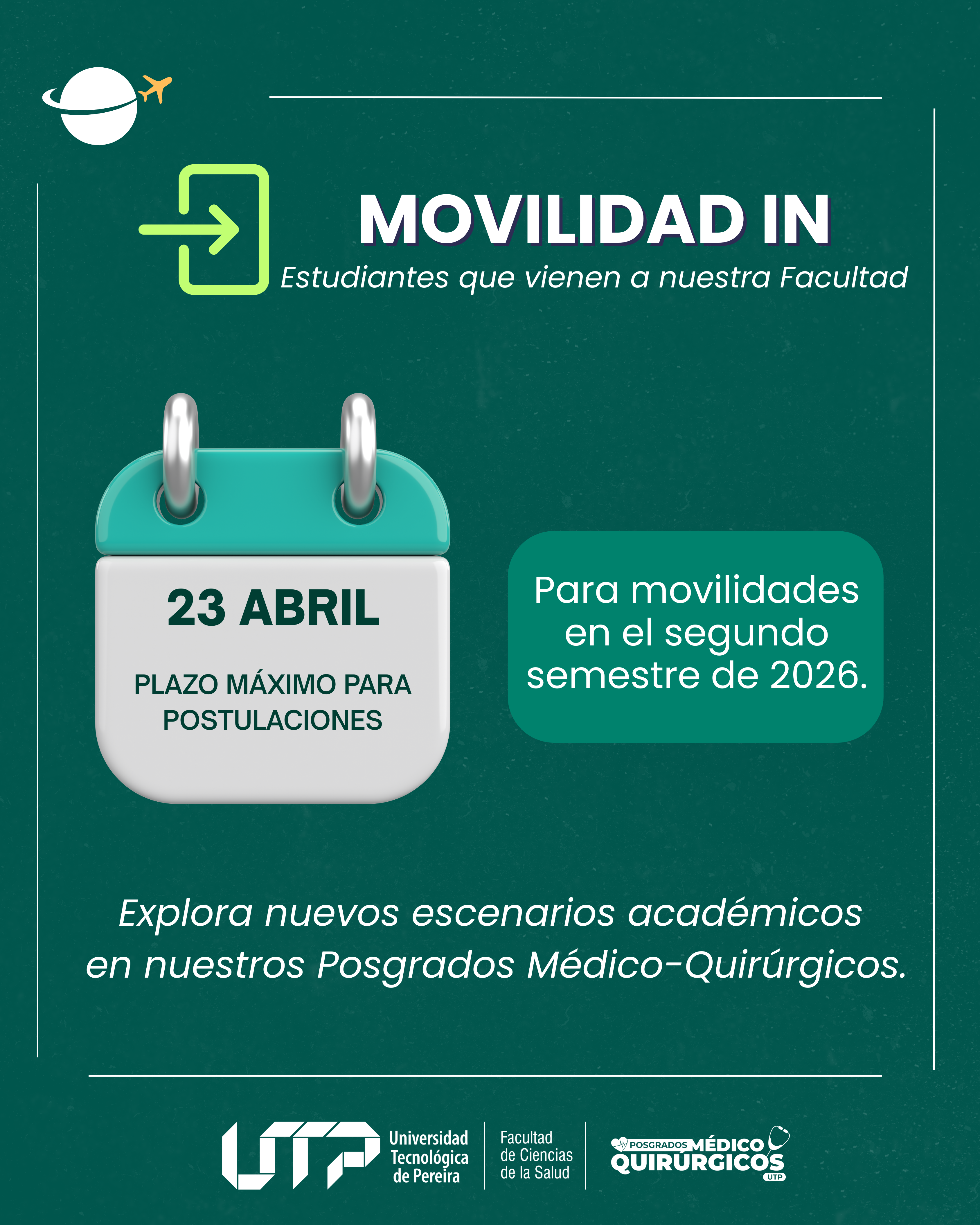 Dirigida a: Estudiantes activos de alguna Especialidad Médico Quirúrgica, para el segundo semestre de 2026. MÁS INFORMACIÓN: posgradossalud@utp.edu.co