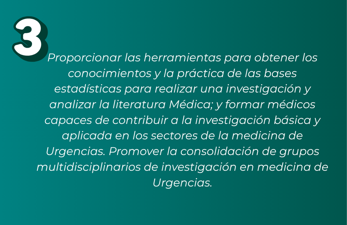 También podrá desenvolverse en programas educativos/formativos que tengan como objetivo la enseñanza de la medicina de urgencias, podrá colaborar en el diseño curricular en los Programas de extensión y Centros Educativos formales. Todo esto, con fundamentos éticos, apoyando a los pacientes y familias en la comprensión del pronóstico, evolución, aceptación de la atención de los pacientes consultantes a los servicios de urgencias.
